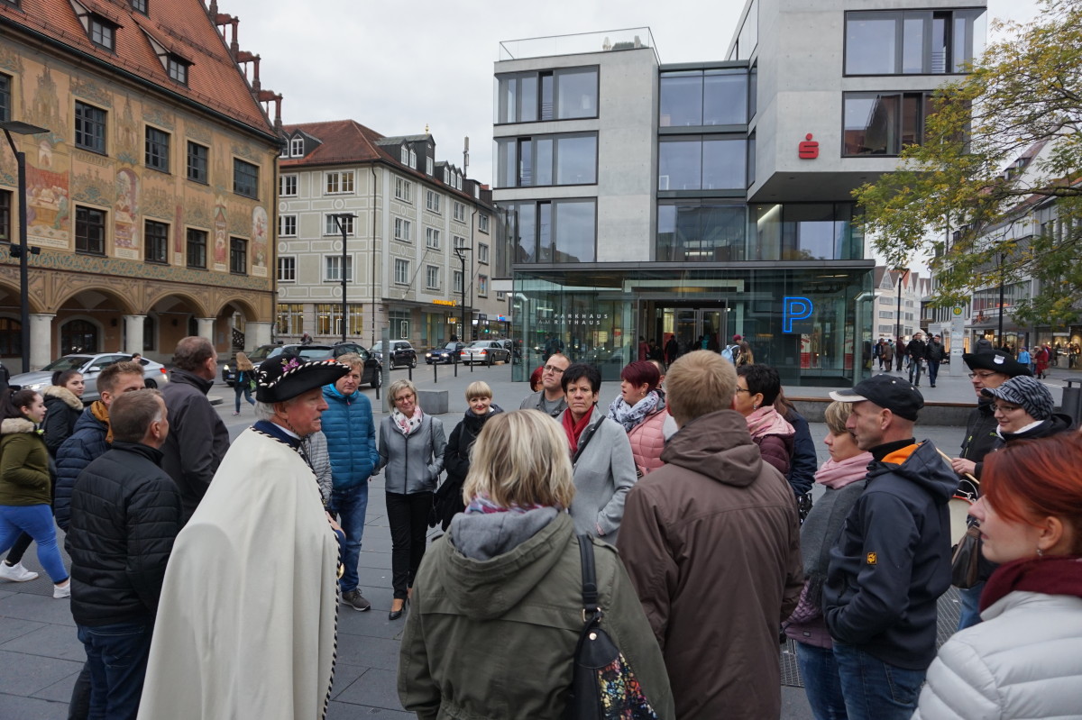 Am Freitag, den 21.10.2016 trafen wir uns mit einem ganz besonderen Gast im Neuen Bau in Ulm. Und zwar mit dem ortsansässigen Stadtmusikanten Karle. Er führte uns mit seinen Augen und seinem Wissen durch die Stadt, wie wir sie noch nie gesehen hatten. Die erste Station war das Ulmer Münster. Einfach wunderschön! Danach ging es in Richtung Rathaus, wahnsinn, welche Geheimnisse dieses in sich hatte. Die Führung endete mit einem absoluten Highlight, einem festlich, antiken Saal, im grünen Hof, an der Herdbrücke. Mit original Bemalungen aus dem Jahre 1380. Er geleitete uns dann zur ältesten Gaststätte Ulms – die Krone. Hier sind wir eigentlich für ein festliches 4-Gänge Menü eingekehrt, doch plötzlich landeten wir mitten in einem Krimi! Das Erbacher Theater Ensemble gab ein spannendes Schauspiel zum Besten. Doch wir saßen nicht nur zum Essen hier, wir alle ermittelten! Und natürlich waren auch Verdächtige unter uns, doch das konnte schnell geklärt werden. Es war ein super Abend, mit viel neuem Wissen, Spannung und leckerem Essen. Ich hoffe, die Gewinner des Wettbewerbs „Krimi-Dinner“ hatten genauso viel Spaß wie wir.